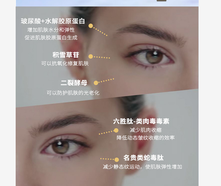 比如:玻尿酸和水解胶原蛋白,能增加肌肤水分和弹性,促进肌肤胶原蛋白形成。